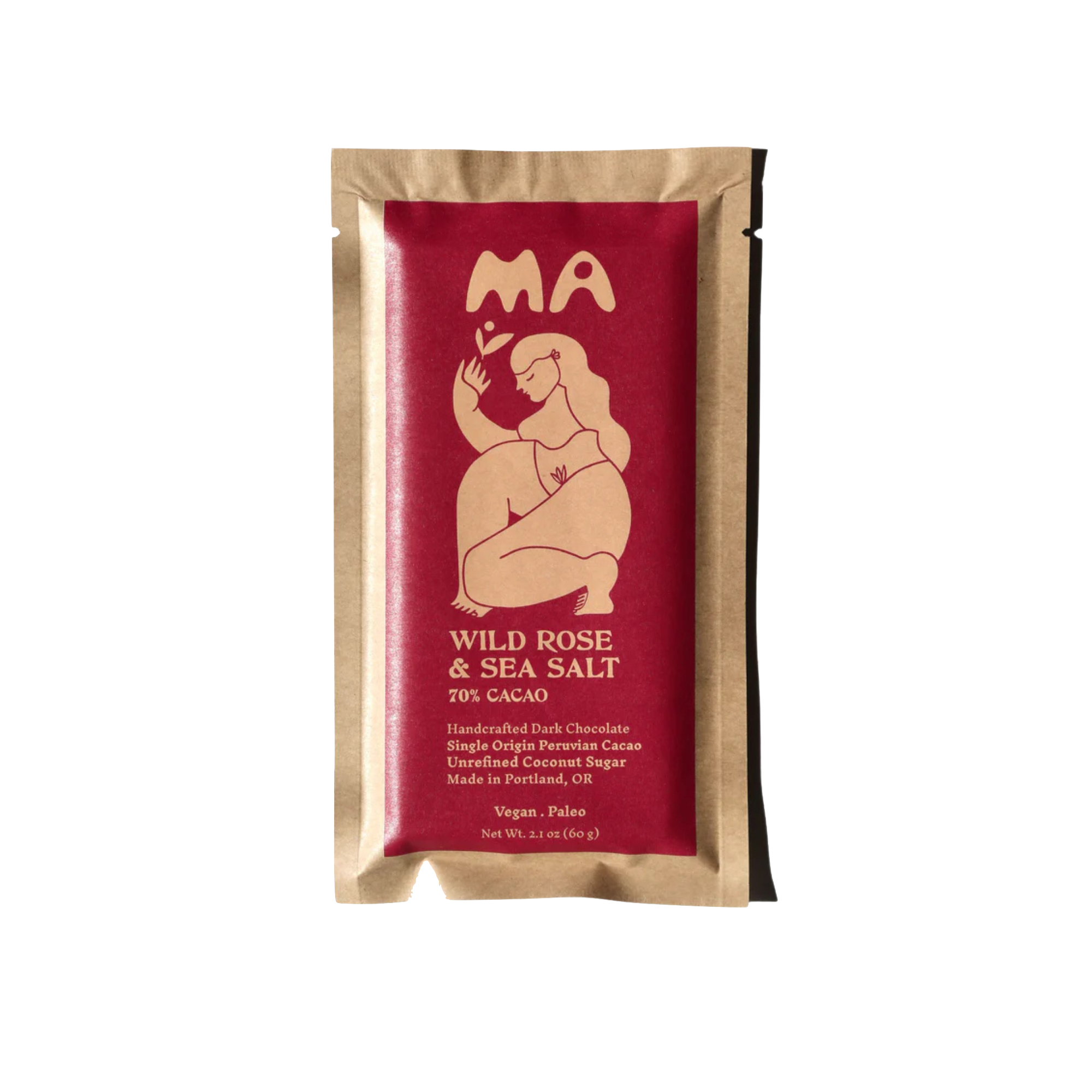 70% dark chocolate paired with Oregon rose petals and flake sea salt from the Oregon coast. A delicately floral experience. Handcrafted from from single origin regenerative Peruvian cacao and unrefined coconut sugar.
